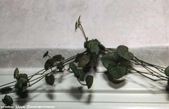 This plant is called "Leuchterblume" (lamp flower because of the shape of its flowers) in German and "hjärtan på snöre" (hearts on a string - you might guess why) in Swedish. The latin name is Ceropegia woodii and it comes from southern Africa. I got it as a very little branch from an aunt and while still in Kiel it crawled over the door frame between living room and kitchen. It was slightly damaged during the transport to Sweden but now it found a new place over the living room door.