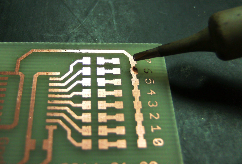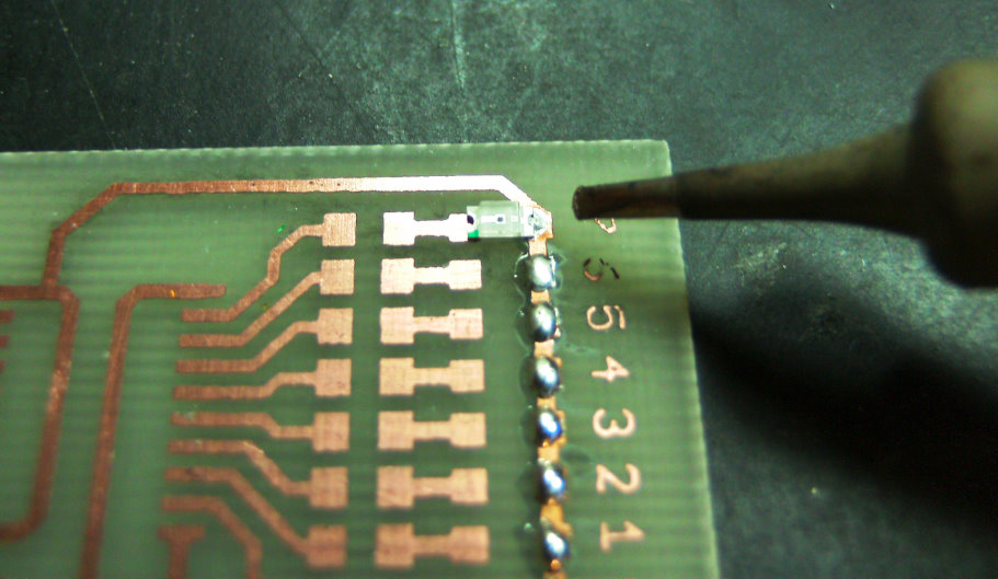 Soldering SMD by hand: putting the device in place and fixing it with the soldering iron.